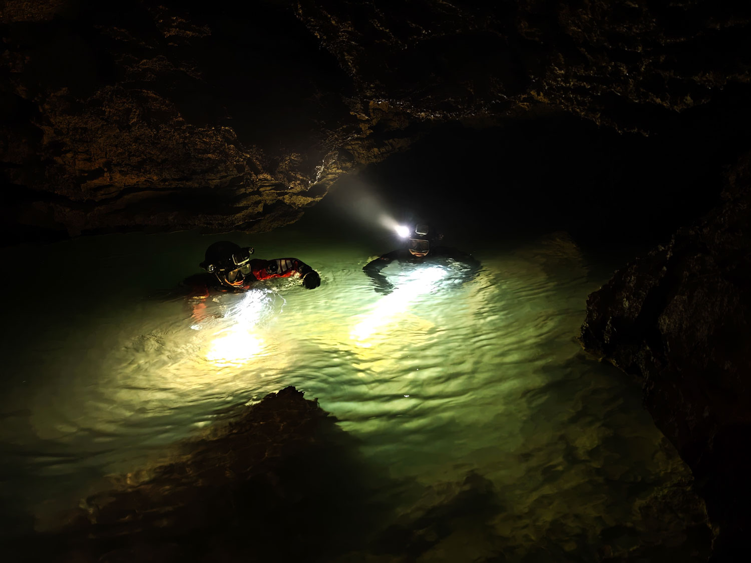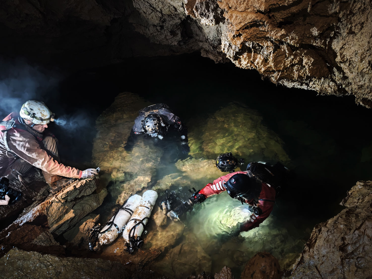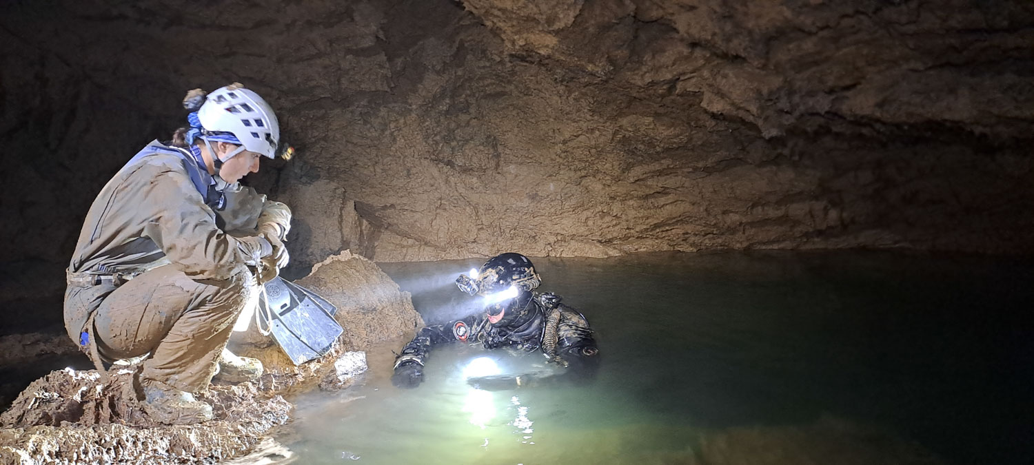 Prvi ogledni potop v Ebenthalu smo opravili 12. junija 2025, ko se je Timotej odpravil v pritočni sifon. Potopil se je 24 m globoko in pri tem porabil cel kolut 100 m dolge vrvice. Za toliko je tudi podaljšal jamo. Sifon je večjih dimenzij, nikjer ožji od 3 m, rov pa se razširi tudi do 10 m premera in se na enaki globini kar nadaljuje! Pretok vode je bil srednje velik, vidljivost pa odlična.
